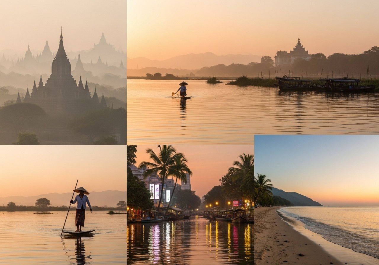 Book popular hotels and boats early, especially around festivals. Pack a light layer for dawn, sunglasses, and modest temple wear. Expect great visibility for Bagan silhouettes, lake reflections, and long beach days with gentle surf.